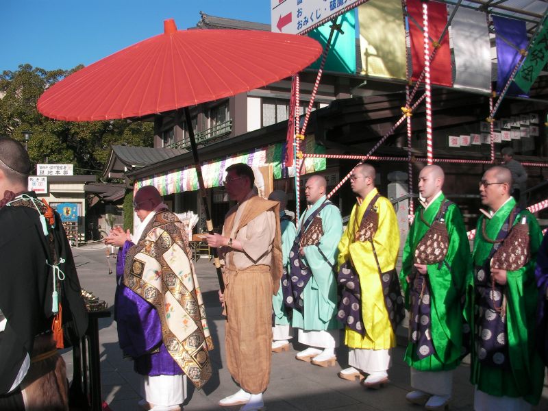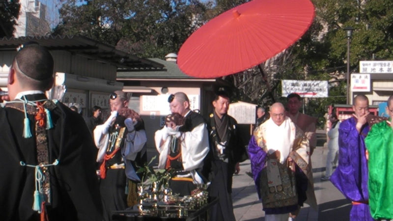 不動尊の境内で、法螺貝の音と共にお坊様登場。