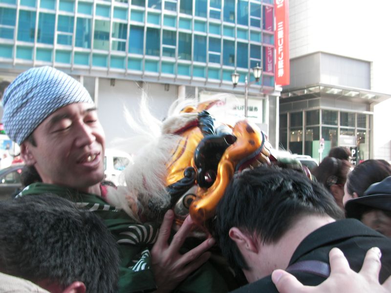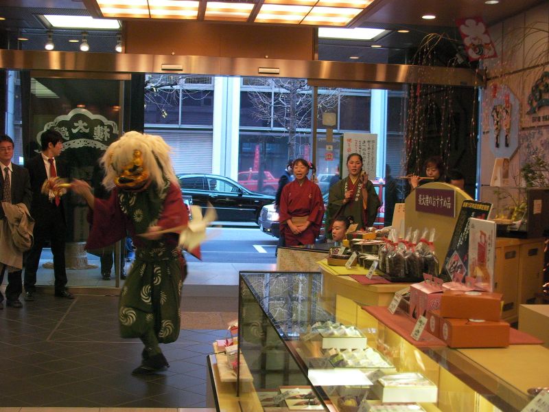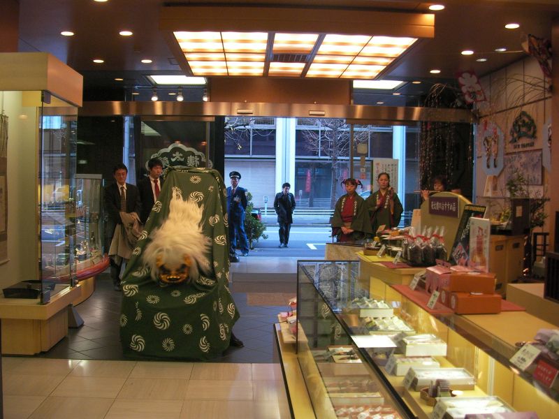 とらやの店頭で通行人を噛んであげる獅子。