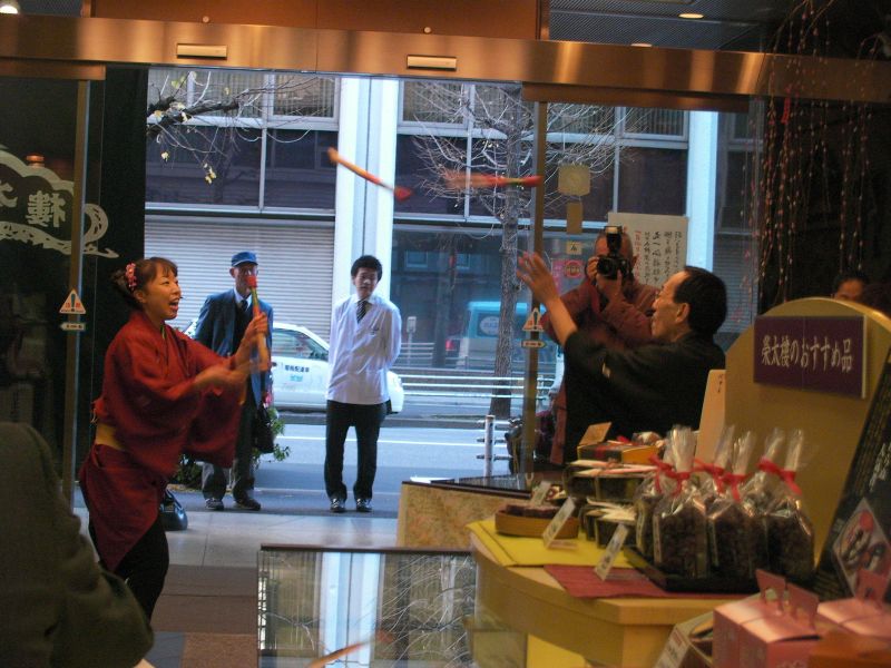 奉納芸が終わったら、日本橋へ移動して門付け開始。
