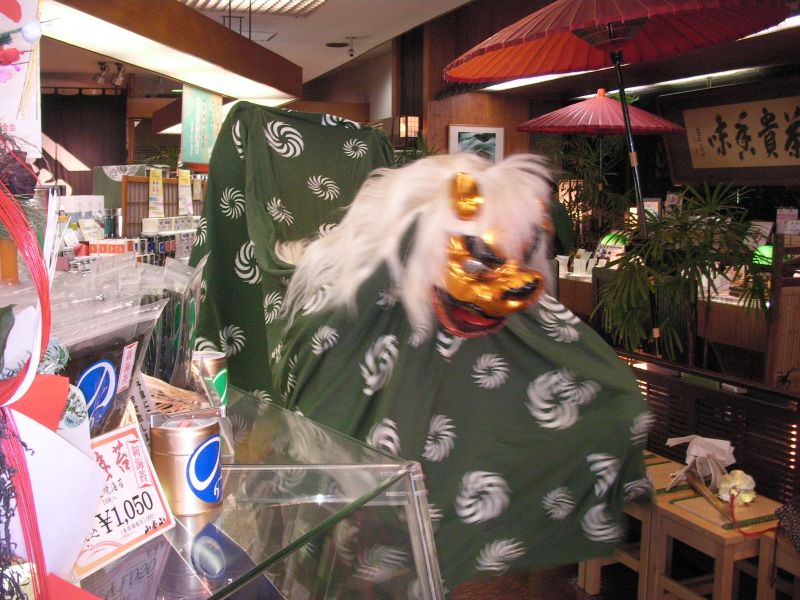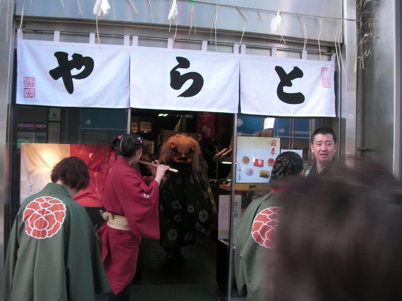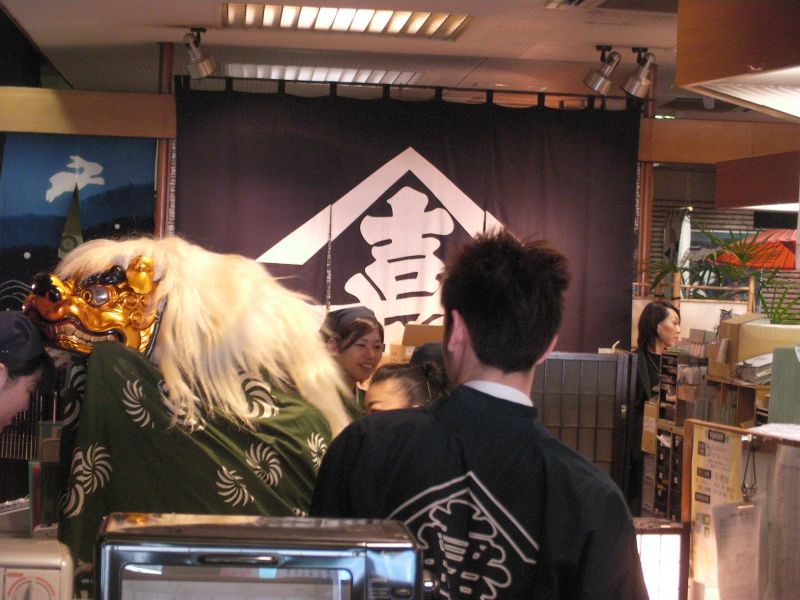 獅子舞は店内を巡って御祓い。店頭のレジスターまで噛んでおりました。
