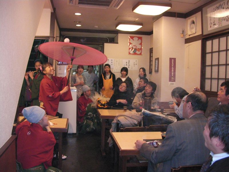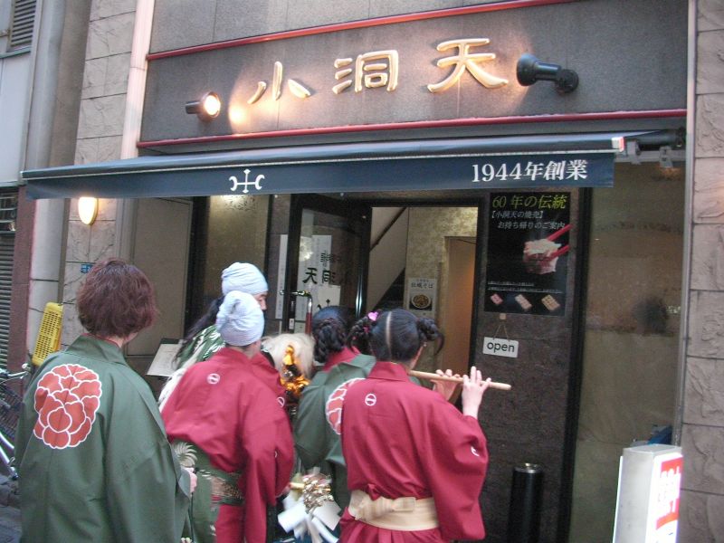 今度は蕎麦屋で門付け、お客さん大喜び。