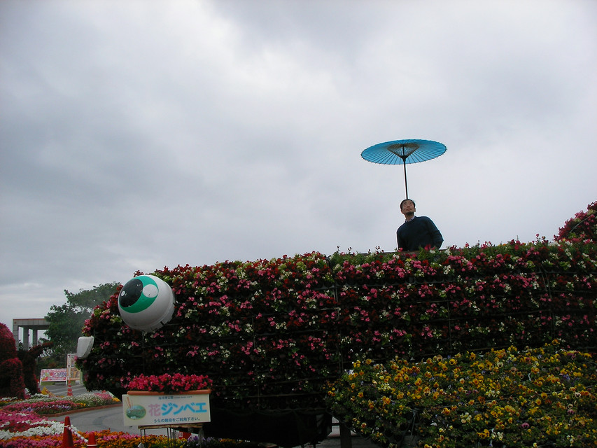 今年は水族館の外にもジンベエ鮫がいたのでさっそく上にのぼって