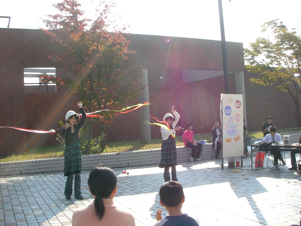 パフォーマンスが終わった後で皆と一緒に練習、傘を頭に