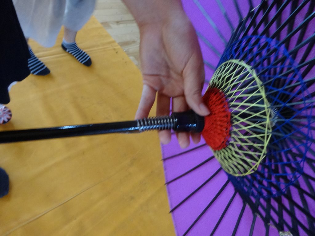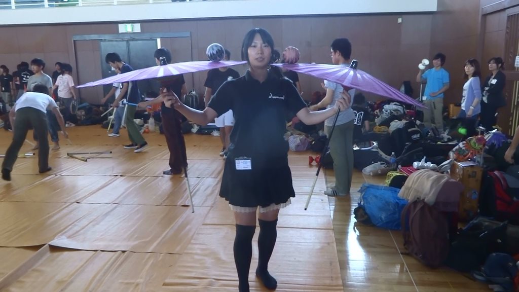 さて体育館へ行くと傘回しをしているひとたちがおり、一通りの技を見せると