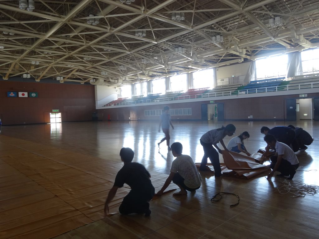 開会式前に皆で準備、床に保護シートを敷く。