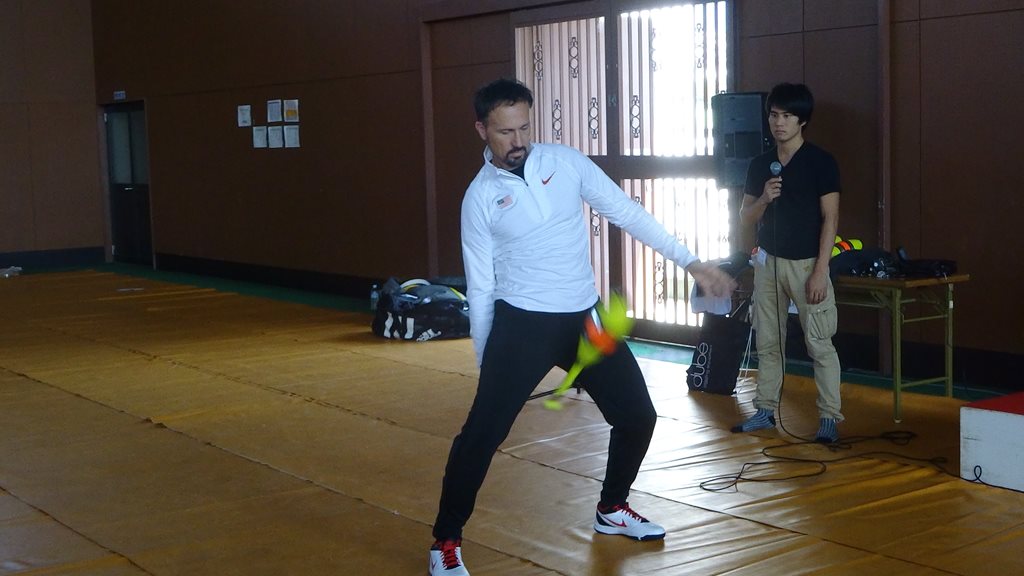 この写真は、リングで顔を煽ぐ際のガットーとウィリーの違いについて語っているところ。