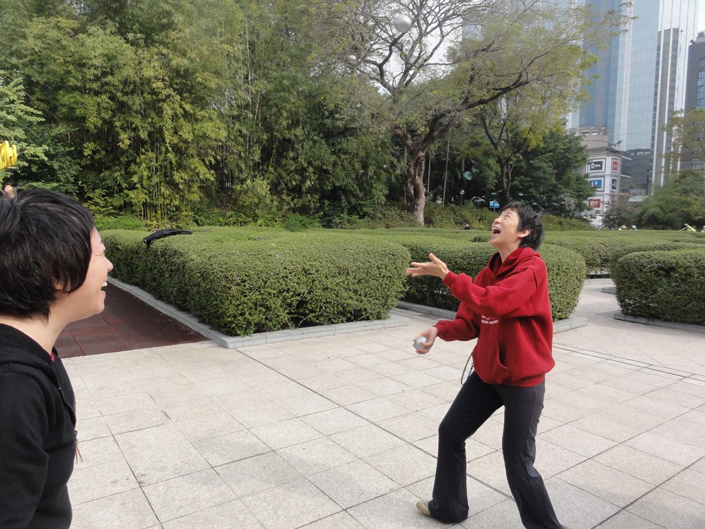 カンフーの中にまざって青空にボールを投げてバチを投げていると爽快な気分!