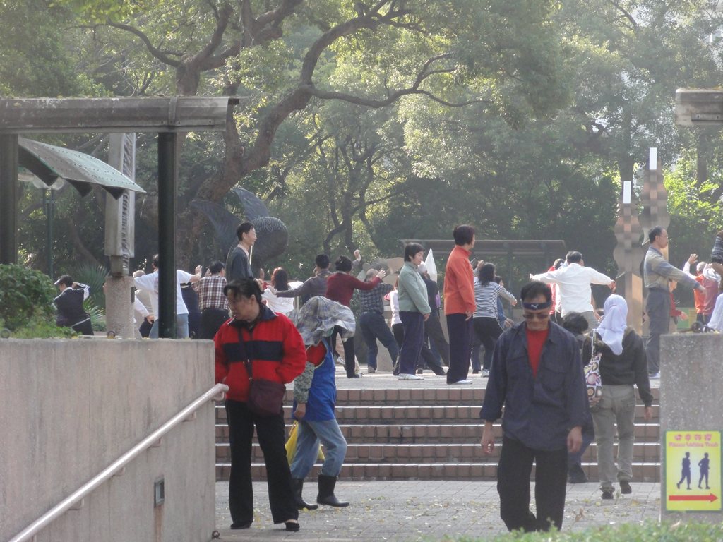 公園の至る所で大人数の団体が汗を流している。中には音楽をかけて盆踊りのよう