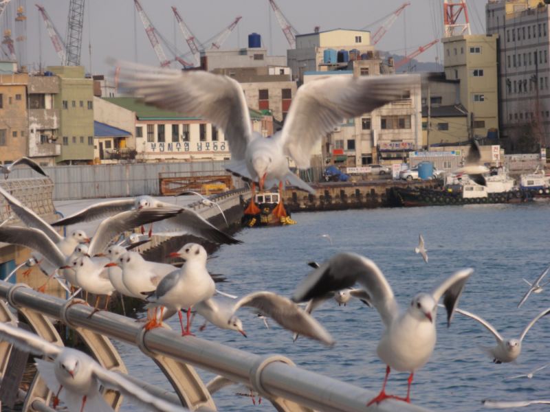 チャガルチ市場は釜山港に面している。ウミネコが多くてたいへん。