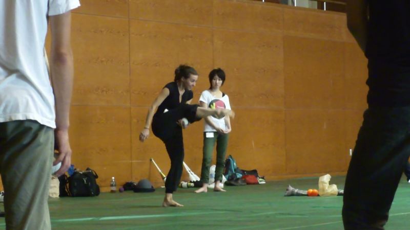 すそが広がっている円柱状のイスを用いたパフォーマンス。転がす、投げる、被る