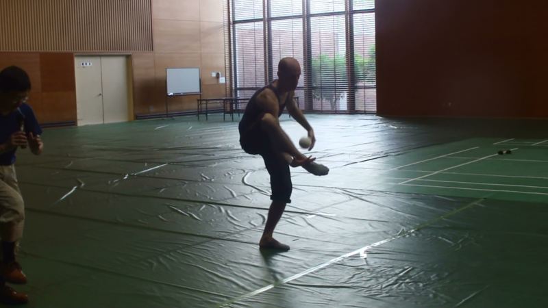 右足をあげて外から右手を入れてボールを投げて膝の上を通し、