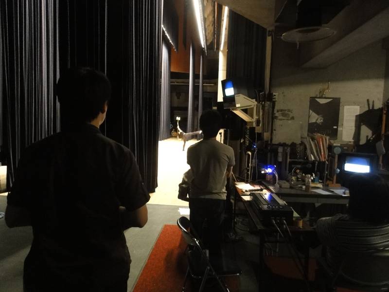 舞台の袖から見守る、舞台監督とスタッフの皆さん。