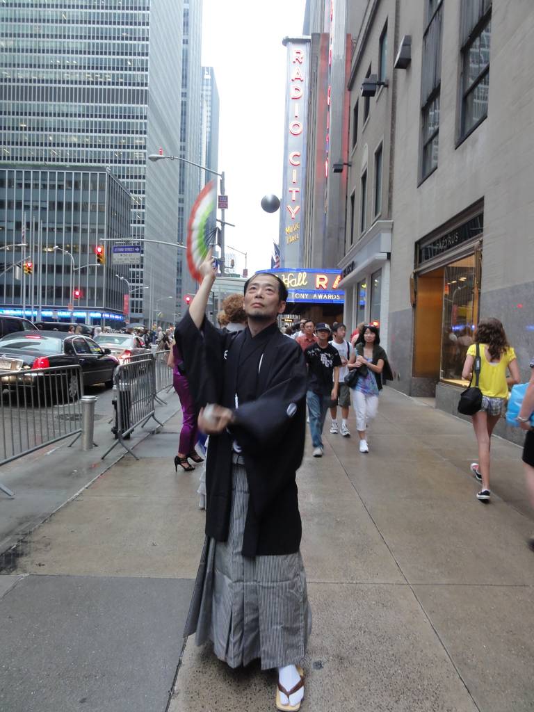 これはBlack tie event なのでいつもはタキシードを着て会場入りしているのだが、今回は初めて紋付袴で挑戦。というわけで記念撮影!写真の奥のRadio City Music Hall がTONY賞会場。