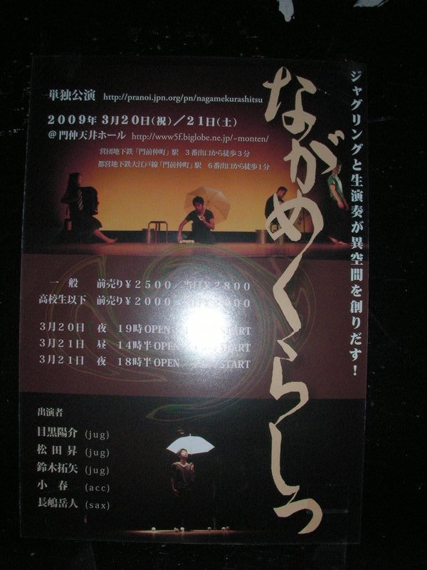 ジャグリングを始めたのは2004年。ボールと傘を中心に投げたりまわしたりしてます。2005年1月にクラブを始めましたが、いまだに3クラブカスケードしかできません。花籠鞠、一つ鞠も始めましたが、まだ基本パターンもできません。
