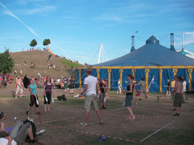 場内はすでにテントやキャンピングカーで一杯、そこここでクラブが舞って
